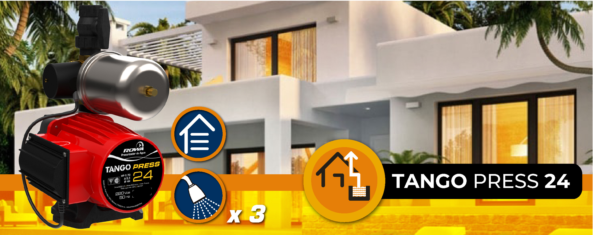 La Rowa Tango Press 24 es una bomba presurizadora doméstica diseñada para aumentar la presión de agua en viviendas con cisterna o tanque elevado. Es ideal para abastecer hasta 3 plantas y 3 duchas, ofreciendo un rendimiento confiable y eficiente.